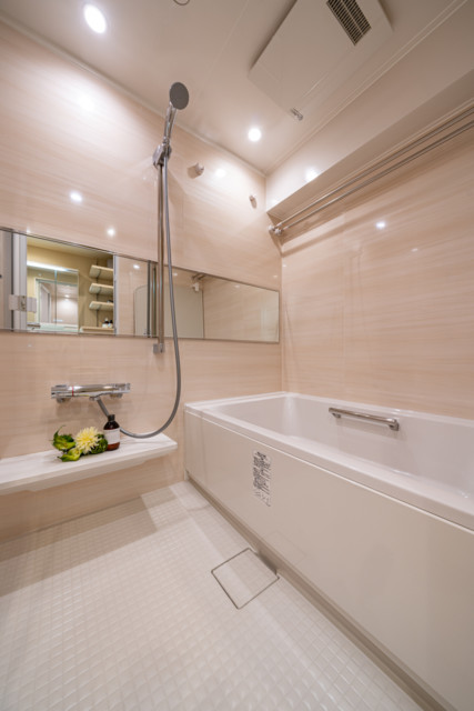 浴室はお部屋のイメージと合わせた木目パネルを使用。ほっと出来る雰囲気でリラックスしたバスタイムを過ごせそうです。新規交換の追い焚き機能付き給湯器はお風呂の準備もボタン一つ!そのまま保温もしてくれるのでご家族でお風呂のタイミングが合わなくても大丈夫ですよ。雨が続く季節に嬉しい浴室換気乾燥機付き。
