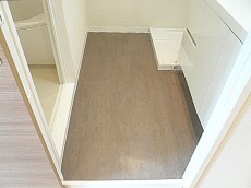 廊下左手にあるサニタリールームです。左にバスルーム、右に洗面化粧台・洗濯機置き場となっています。
