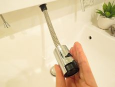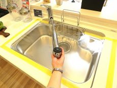 浄水機能付きの水栓はシャワーヘッドになっています。シンクの隅々まで水を流すことはもちろん、花瓶などの背の高い容器に水を注ぐ際にも大活躍してくれます。