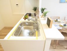 リビングダイニングを見渡せるカウンタータイプ。食器洗浄乾燥機が付くので片付けに使う時間を短縮でき、生活にゆとりができますよ。