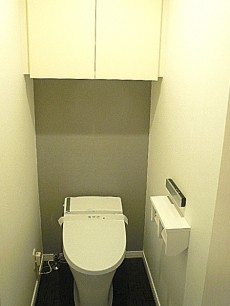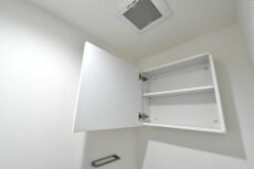 トイレはTOTO製の洗浄機能一体型。トイレットペーパーのストックや掃除道具を入れるのに便利な吊戸棚も付いています。