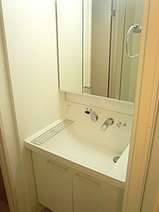 洗面化粧台です。三面鏡は見やすく、ミラー裏はキャビネットに!細々としたヘアーアクセサリーや化粧水、歯ブラシなど整理整頓しやすいですね。洗面ボウルも大きく深くと使い勝手が良いでしょう~下部びある収納にはお掃除道具など置けそうです。