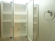 水栓はハンドシャワータイプ。ヘッドが引き出せるので洗面ボウルを流したり、寝ぐせ直しくらいなら何とかなりますよ。三面鏡裏のキャビネットには洗面周りの細々としたものをスッキリ収納可能です。