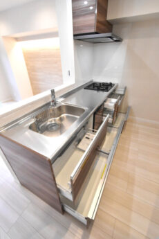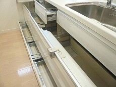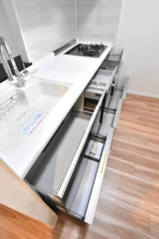 収納は調理台下のスライドキャビネットと吊戸棚。スライドキャビネットは物の出し入れがしやすく、ぎっしり詰めても中の確認が出来る優れもの。反対に出し入れのしづらい吊戸棚上段にはあまり使わない物を入れておきましょう。