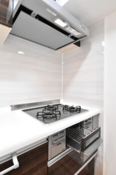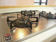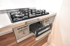 コンロは3口、グリル付き。温度調節やタイマーが使える高機能タイプです。お魚グリルなんて呼ばれることもあるグリルですが、魚だけってわけでもないんですよ。お掃除が面倒ならば「グリラー」という便利な物もあります。蓋付の陶器のお皿みたいなもので、グリルはほとんど汚れません。グリル意外にも直火や電子レンジでも使えるので、この機会に一つ入手してみてはいかがですか。