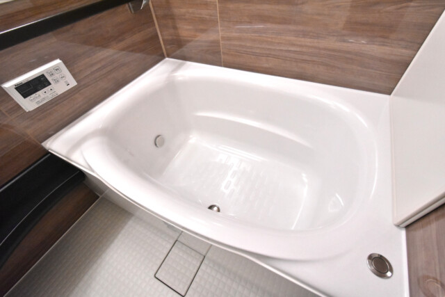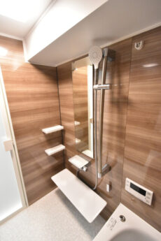ブラウンの鏡面仕上げパネルで高級感のある浴室。