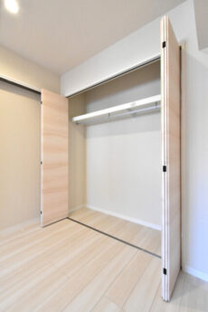 右奥にはフルオープンになるクローゼット。大きさではウォークインクローゼットには敵いませんが、使い勝手なら負けていません!