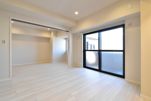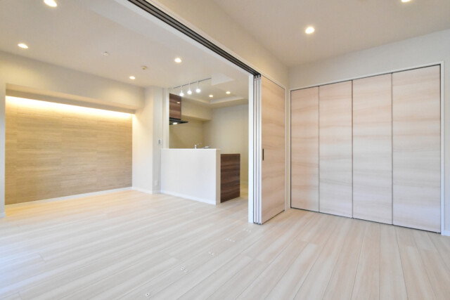 隣の洋室との仕切り戸を開けてLDKとつなげた様子です。南西向きのバルコニーに面したワイドスパンのお部屋になり、とても広々と感じますよ。家族構成や状況に応じて使い方を選べるのは嬉しいですね。