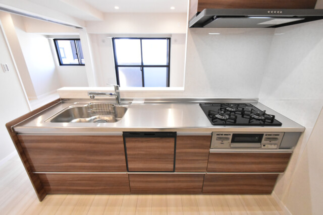 調理台の下にはスライドキャビネットと食器洗浄乾燥機。