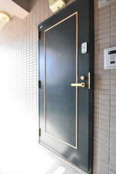 玄関ドアはゴールドのラインが入っていて高級感がありますね。ドア横のテレビモニター付きインターホンでお部屋の中から訪問者の映像を確認する事が出来ます。手が離せない時などにわざわざ玄関まで来なくて便利ですよ。