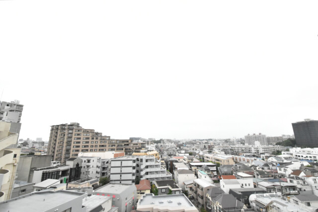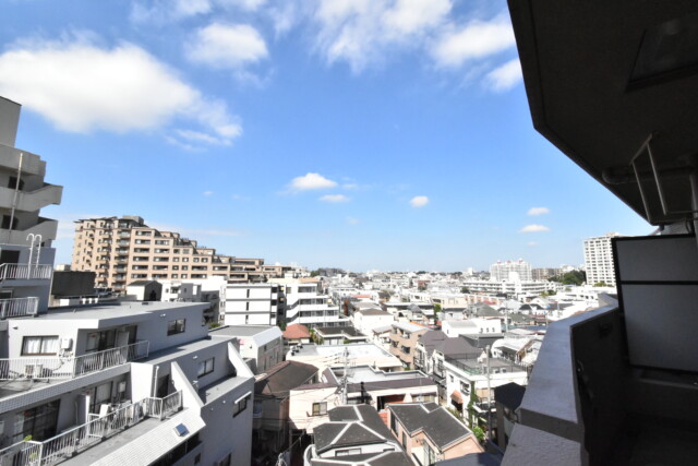 二部屋分(しかも縦+縦)の幅がある広~いバルコニー。もちろん隣の洋室からでも出られますよ。外には開放的な眺めが広がっています。正面には高いビルもありますが距離がありますし、何と言ってもこちらも9階ですからね。
