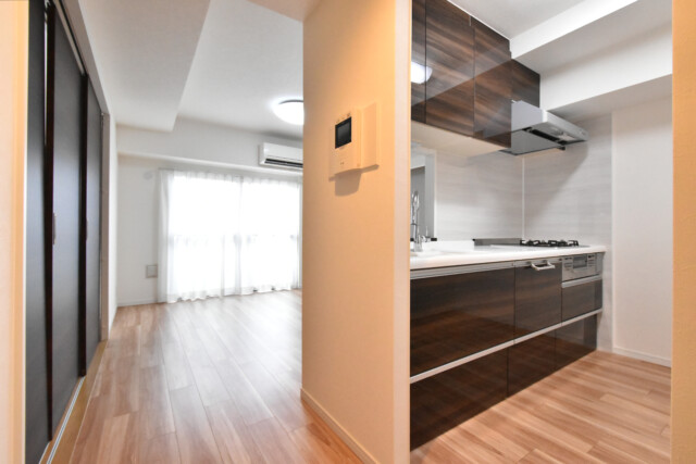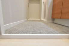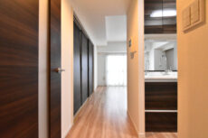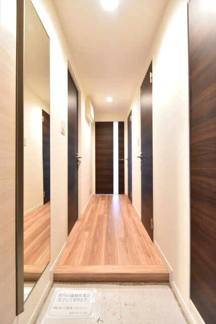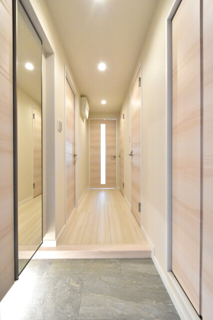 玄関から真っすぐ伸びる廊下は、木目を生かした明るめのフローリングと白のクロス。建具もフローリングと近い調子で全体的にナチュラルな仕上がりになっています。リノベ完成直後ということでまるで新築のよう♬
