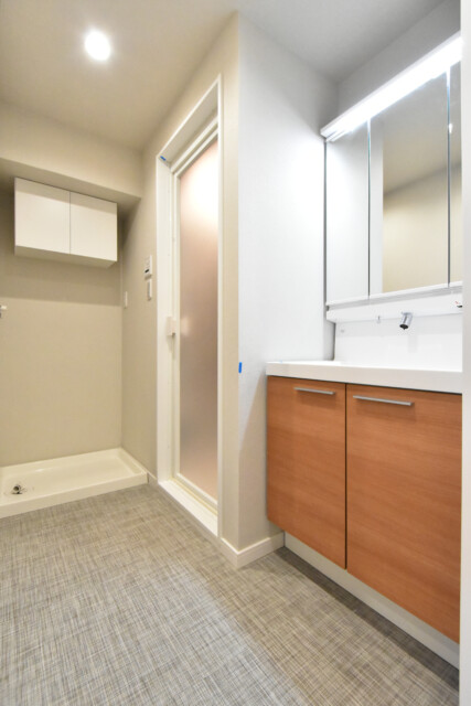 洗濯機スペースには吊戸棚も付いているので、洗剤や洗濯ネットなど洗濯関係の物はまとめて置いておけますよ。洗面台は身だしなみチェックに便利な三面鏡付。