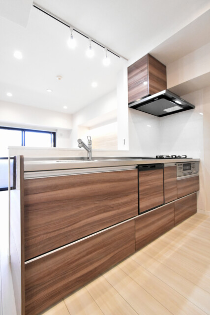 キッチンは人気のカウンタータイプ。コミュニケーションが取りやすく、調理中でもご家族やご友人との一体感があるキッチンです。さらに、リビング側からはキッチン内が見えづらいのもメリットのひとつ。ひと目を気にせず、思う存分腕を振るえますよ(^^)