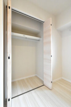 また、収納としてクローゼットが付いていますので、収納家具を外に置く必要もありません。間口が広いタイプで、中がひとめで確認出来て使いやすいんですよね。衣装ケースなどを使えば収納力のアップも可能です。