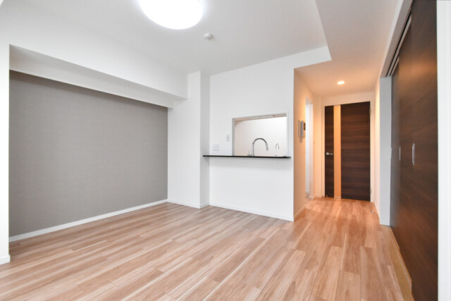 木目を生かしたナチュラルなフローリングに白のクロスと、アレンジの余地を残したシンプルな内装。アクセントも邪魔にならないよう大人しめのグレーになっています。