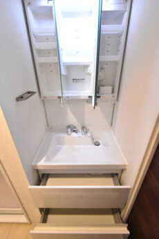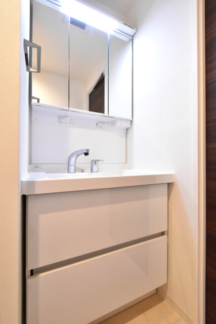 真っ白で清潔感のある洗面化粧台は、身だしなみチェックに便利な三面鏡付き。上部の照明のおかげで鏡を開いても影になることもありません。