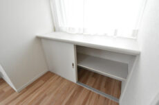 片側にはフルオープンになる使い勝手のよさそうなクローゼット。窓際には上がカウンターになった収納。カウンターには写真や小物などを置いてインテリアを楽しむことも出来ますよ。日当たりもいいので観葉植物なんかもいいかもしれません。