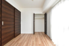 クローゼットは先の洋室と同じ間口の広いタイプ。幅はあまりありませんが、その分奥行があって大きな物も入れやすいですよ。窓の外は外廊下ですので、面格子、二重サッシ、網入りガラスなど防犯面に配慮がされています。