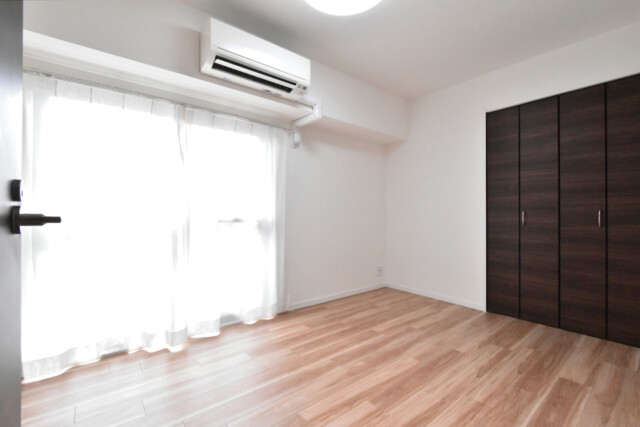 南東向きの窓があるお部屋です。廊下に面して独立性が高く、寝室によさそうですね。こちらの洋室は柱のないきれいな形をしているので、大きいサイズのベッドやシングルベッド二つも余裕で置けますよ。