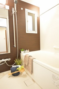 バスルームは木目柄の壁パネルが使われており、リラックスしたバスタイムが過ごせそう!追い焚きに浴室換気乾燥機能付きと設備も◎。予備暖房、涼風機能もついています。