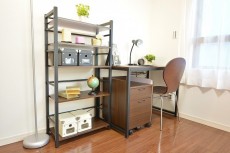 クローゼットとオープンシェルフが設置されています。収納が多いと居住スペースが広く使えるのがうれしいですね!
