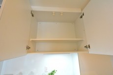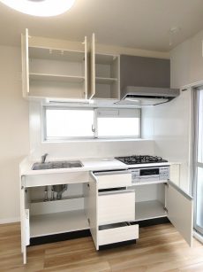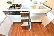 収納は充実しています。下部に調理器具、上部の吊り棚に食器を入れておけば、食器棚が必要ないので、とても広くお使い頂けます。