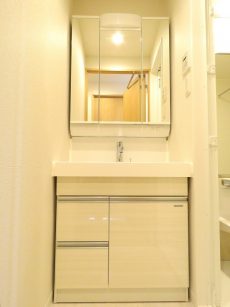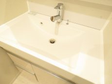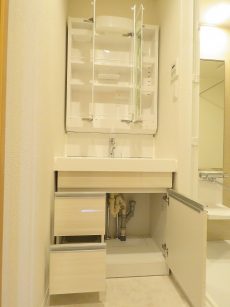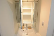 洗面化粧台は鏡の裏、引き出しと収納スペースが豊富です。
