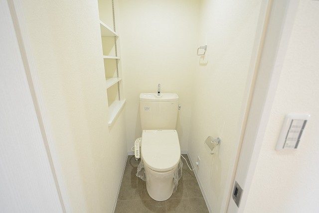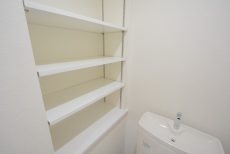 廊下に上がってすぐ左側にトイレがあります。上部に吊り棚が設置されているので、トイレ内を清潔にお使い頂けそうです。