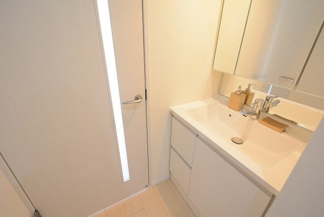 玄関の正面のドアはサニタリールームです。こちらにはピンクベージュのタイルが敷かれていて、とても可愛く綺麗です☆