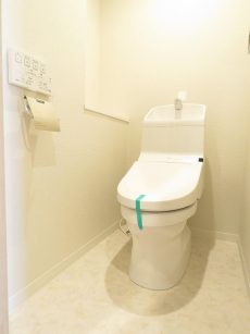 白基調で清潔感のあるトイレ空間。TOTOのウォシュレット付きです。