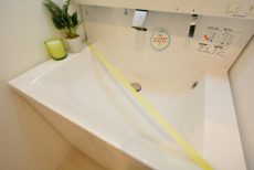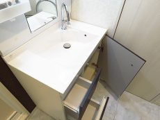 洗面化粧台は鏡の裏が一面収納スペースになっています。