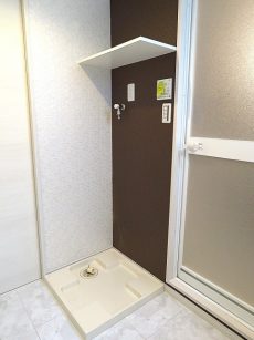洗濯機置場横の黒いラインの入った扉はトイレ。