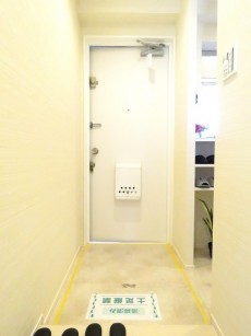 白基調の明るい玄関ホール。人感センサーがついており、人の気配で自動で照明が消灯します。消し忘れが無く経済的。インターホンは来訪者の顔が確認できるTVモニターがついています。玄関扉をあける前はこちらでご確認を。