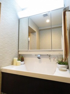 洗面化粧台は鏡の裏が一面収納になっており、ゴチャゴチャしがちな水まわりの小物類もスッキリ片付けておけそうです。蛇口はひっぱるとシャワーとしてもご利用いただけます。