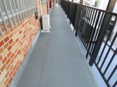 共用廊下はこんな感じの外廊下タイプ。すぐ横が学校なので学生の声がたまにうっすら響いてきます。
