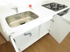 キッチンは壁面に馴染む白。3口コンロがあるのでお料理もスムーズに進めらるハズ!