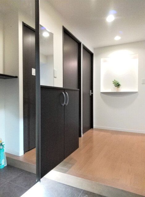 玄関正面にはドアが無く、戸口から室内が見えづらいレイアウトになっています。宅配便やフードデリバリーなどの利用機会も増え、知らない人が訪ねてくることが多い今の時代にマッチした造りといえますね。正面にはライティングされたニッチカウンターが設置され、帰ってきた時にお出迎えしてくれるよういろいろ飾り付けることができますよ!シューズボックスはもちろん、クローゼットも備えた収納豊富な玄関です。