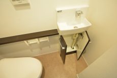 手洗いカウンターが付いていて、下部はちょっとした収納になっていました。もちろん温水洗浄便座も完備ですよ。ちなみに、『ウォシュレット』って某メーカーの商品名だってご存知ですか?こちらは『パナソニック』さんの商品なので、『ビューティ・トワレ』になります。