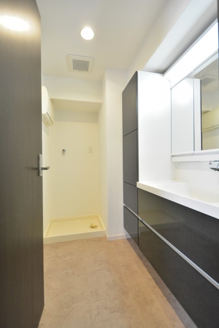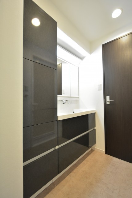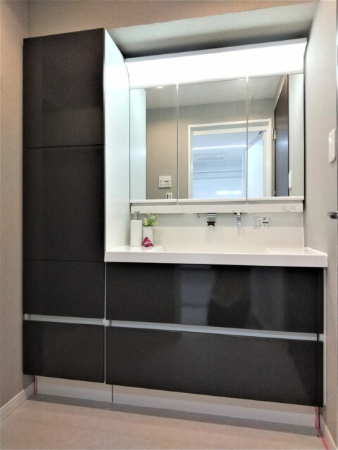 洗面室には洗面化粧台のほかに洗濯機スペースと浴室がまとまっていて、脱衣所も兼ねています。幅の広い洗面化粧台は譲り合えば二人くらいなら並んで使えそう♪忙しい朝とかには嬉しいですよね。三面鏡裏のミラーキャビネットをはじめ、リネン棚も付属していて収納も豊富ですよ。