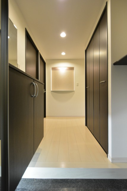 玄関ドアを開けると、落ち着いた雰囲気の廊下が伸びていました。正面にはニッチが見え、そこから廊下は右曲がって続いているようです。戸口から居室の中が見えないような、プライバシーに配慮された造りになってますね(^^)