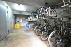 左側を下に降りると鍵のかかる駐輪場があります。その奥はゴミ置場になっていましたよ。ちなみに駐車場はありません。
