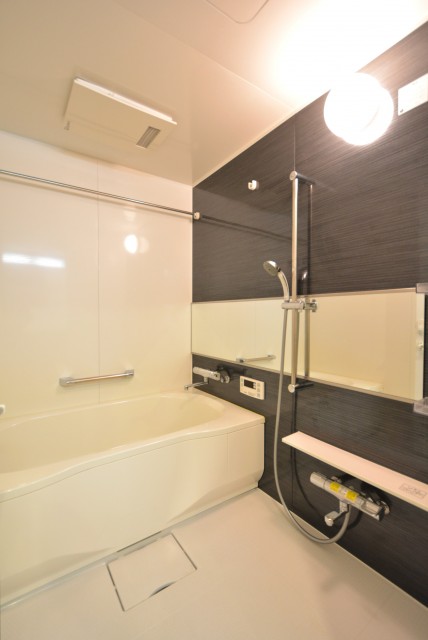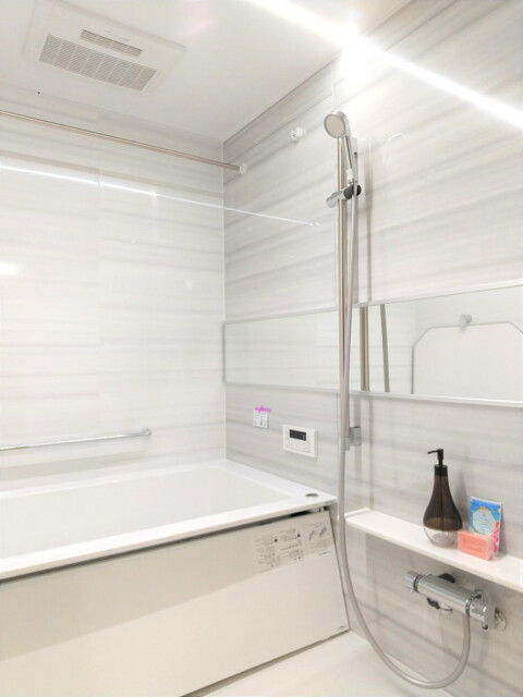 浴室は白とグレーの明るい雰囲気。疲れを癒してリフレッシュするのにピッタリですね。追い焚き機能や浴室換気乾燥機などの便利機能も充実!これで、お天気を気にせずに洗濯機を回せますよ。