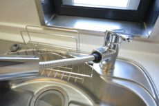 水栓は浄水機能付きシャワー水栓です。切り替えひとつで水道水が美味しいお水に早変り。ヘッドが伸びてシンクのお掃除などにも便利です。