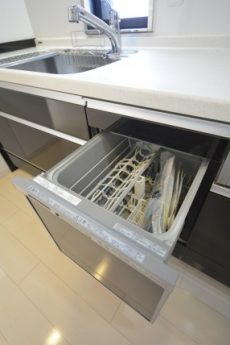 キッチンは少し奥まったところに壁付けタイプ。程よい一体感がありながら、あまり目立たないように位置関係になっています。システムキッチンには食器洗浄乾燥機や浄水機能一体型水栓など家事を助けてくれる機能付き。お料理はもちろんお米を研いだりにも贅沢に使っちゃいましょう。