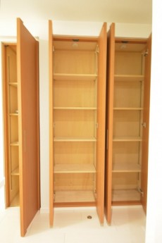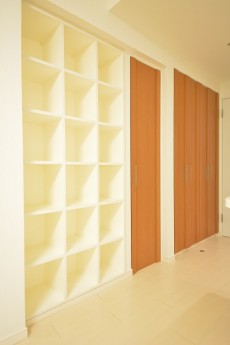 吊戸棚も背後にありますが、正面は一面が棚付きの収納になっています。