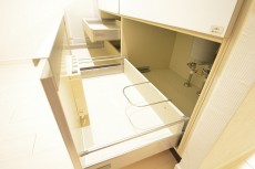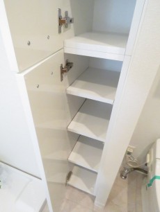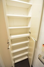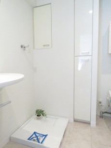 トイレのお隣は洗濯機置場。まわりには扉付きの収納が設けられています。洗剤やシャンプーのストック、タオル類はこの辺りに仕舞っておく感じでしょうか。
