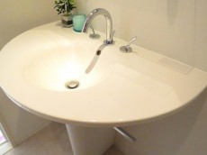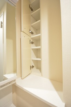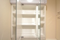 洗面化粧台は3面鏡の裏が一面収納になっており、ゴチャゴチャしがちな水まわりも