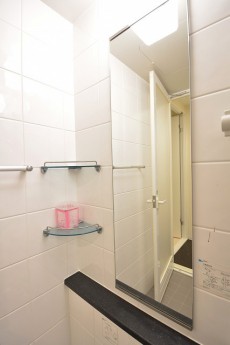 タオル掛けやちょっとした小物がおけるガラスの棚がついています。