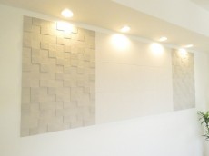 壁面の一部には調湿・消臭効果のあるエコカラットも。ダウンライトで照らされお部屋のアクセントにもなっています。